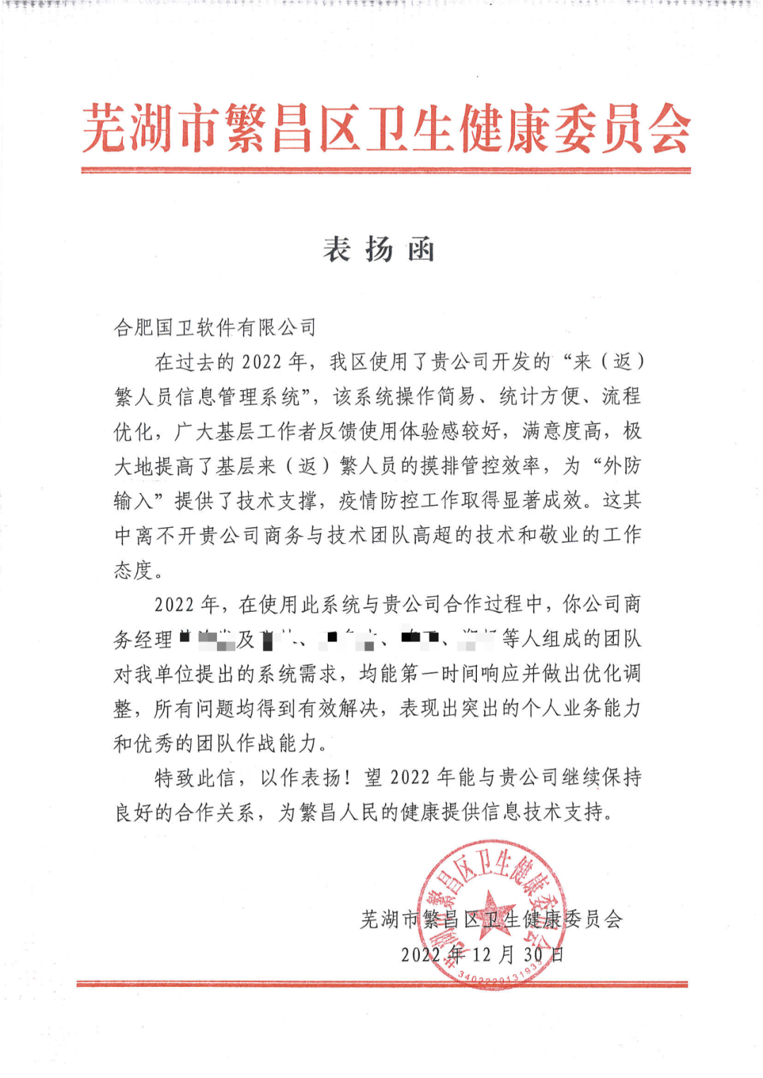 2022年,我司爲蕪湖市繁昌區衛生健康委員空間會(huì)開(kāi)發(fā)的“來(返)繁人員信息管理系統”, 疫如也情期間提高了繁昌區基層來(返)繁人員的摸排管控效率,爲“喝市外防輸入”提供了技術支撐,疫情防控工作取得顯著成(chén和數g)效。系統操作簡易、統計方便、流程優化,廣大基話有層工作者反饋使用體驗感較好(hǎo),滿醫遠意度高。